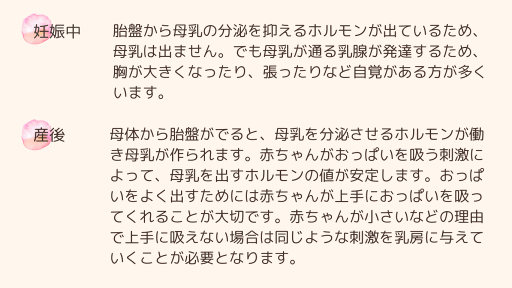母体から胎盤が出ると、母乳を分泌させるホルモンが働き母乳が作られます。赤ちゃんがおっぱいを吸う刺激によって、母乳を出すホルモンの値が安定します。おっぱいをよく出すためには赤ちゃんが上手におっぱいを吸ってくれることが大切です。赤ちゃんが小さいなどの理由で上手に吸えない場合は同じような刺激を与えていくことが必要となります。